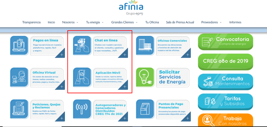 - Visite www.afinia.com.co y haga clic en la sección «Línea de atención Electricaribe».