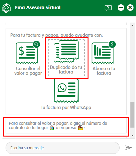 - Pide la factura al asistente virtual Ema en la web o a través de whatsapp 302 300 01 15